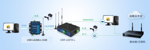 LG210與lora節(jié)點(diǎn)(LG206-L-H20)安裝天線,使用各自配套電源適配器供電,LG206串口連接電腦,LG210網(wǎng)口連接路由器或者交換機(jī),電腦也接入該路由器或交換機(jī)。