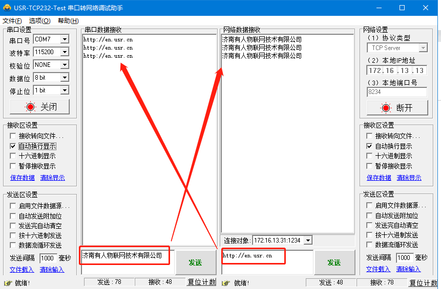 在USR-TCP232-Test軟件,的串口端打開LG206的串口, 可測(cè)試通信。