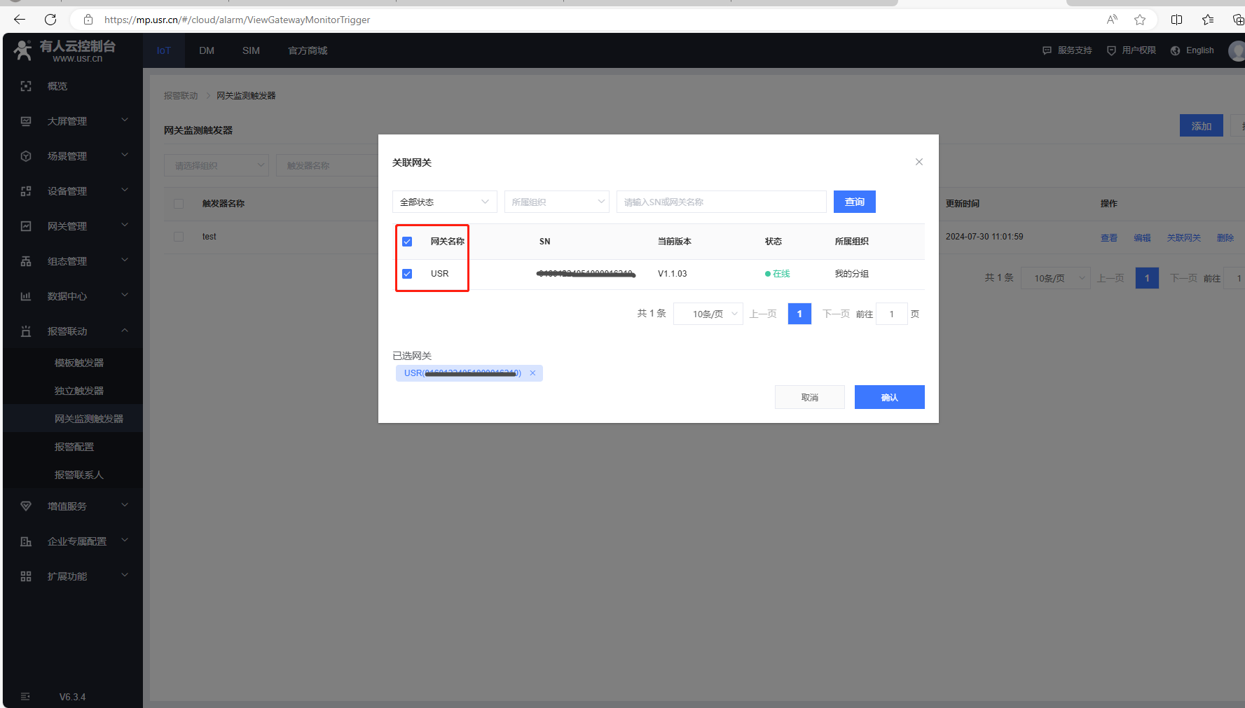 (2)IOT平臺,點擊報警聯(lián)動,點擊網(wǎng)關(guān)監(jiān)測觸發(fā)器,點擊關(guān)聯(lián)網(wǎng)關(guān)。勾選路由器網(wǎng)關(guān),點擊確認(rèn)。