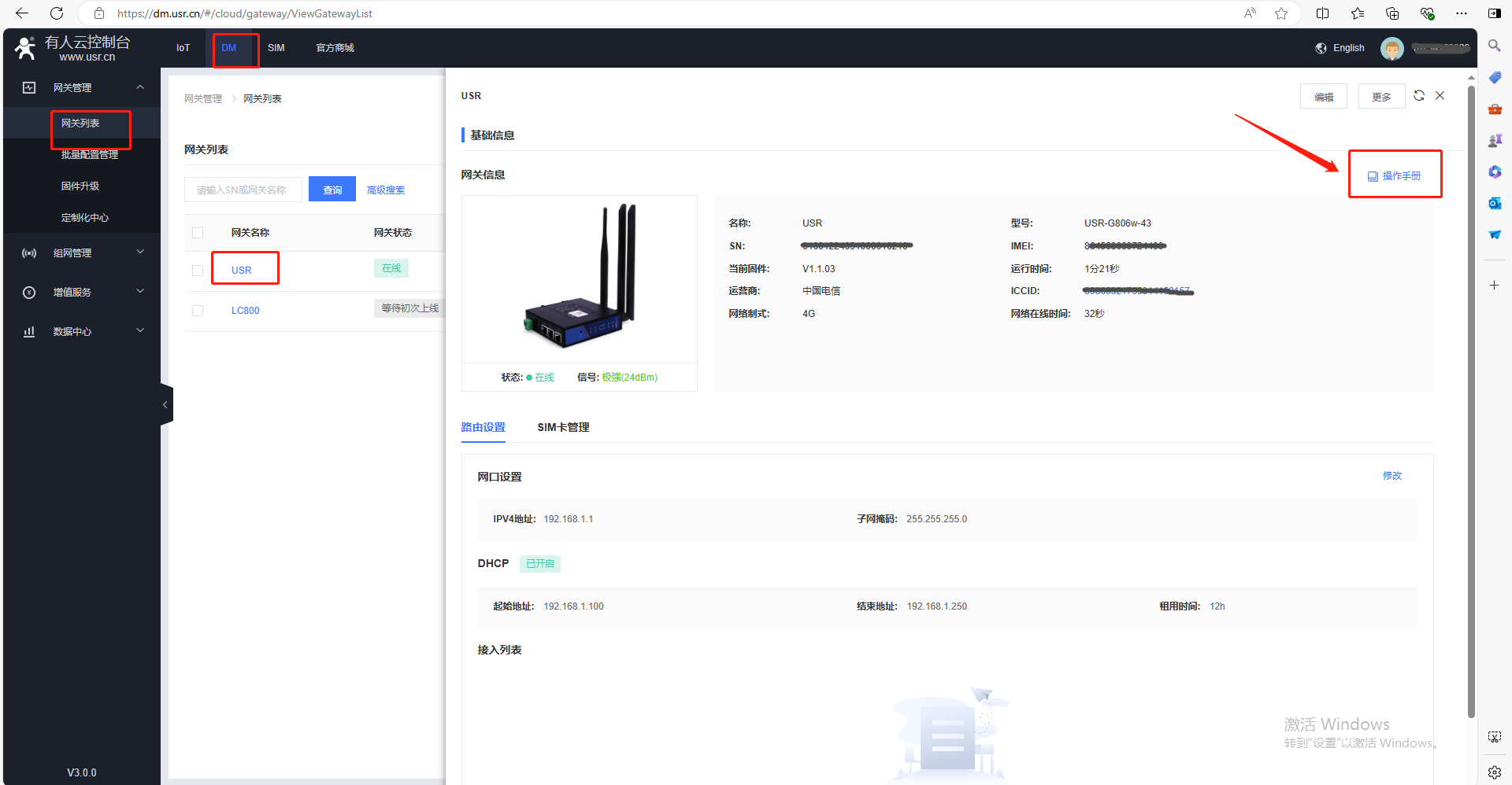 DM平臺,點擊網(wǎng)關(guān)管理,點擊網(wǎng)關(guān)列表,點擊網(wǎng)關(guān)名稱,在展示的信息,可以點擊操作手冊,跳轉(zhuǎn)到路由器的說明書。