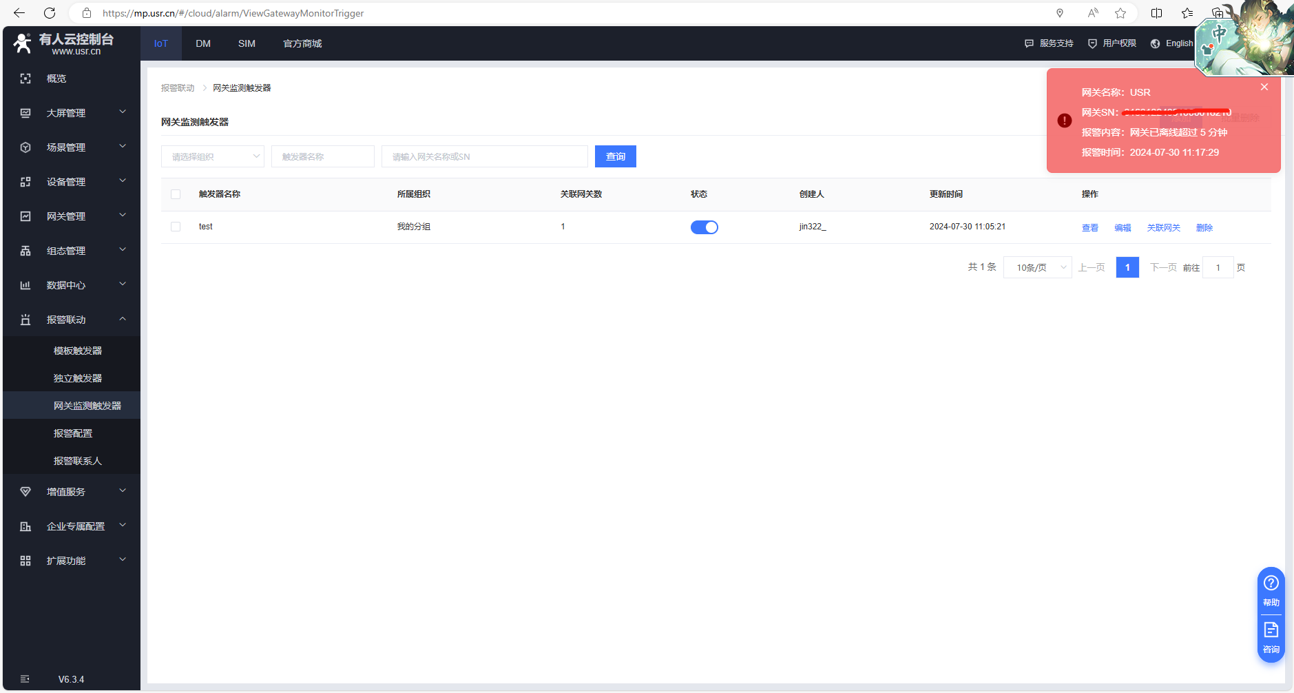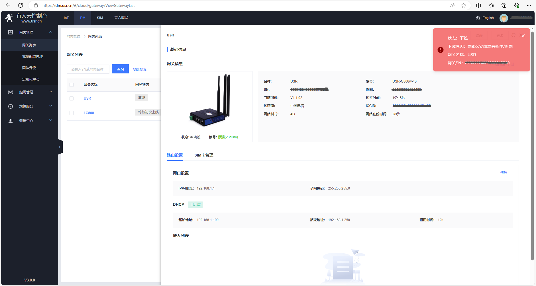 (3)將路由器斷電,會從有人云離線,等離線時間大于5分鐘,用人云收到一條報警信息,網(wǎng)關(guān)已離線超5分鐘。