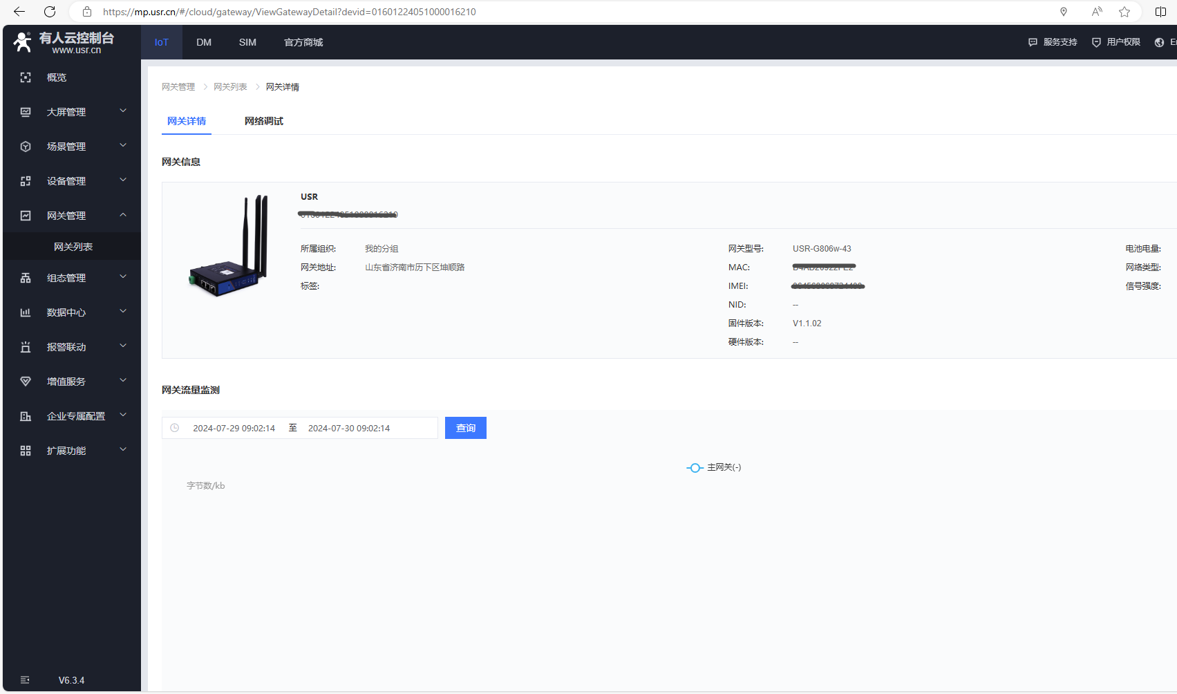 IOT平臺,點擊網(wǎng)關(guān)管理,點擊網(wǎng)關(guān)列表,可以從網(wǎng)關(guān)流量監(jiān)測,檢測流量。