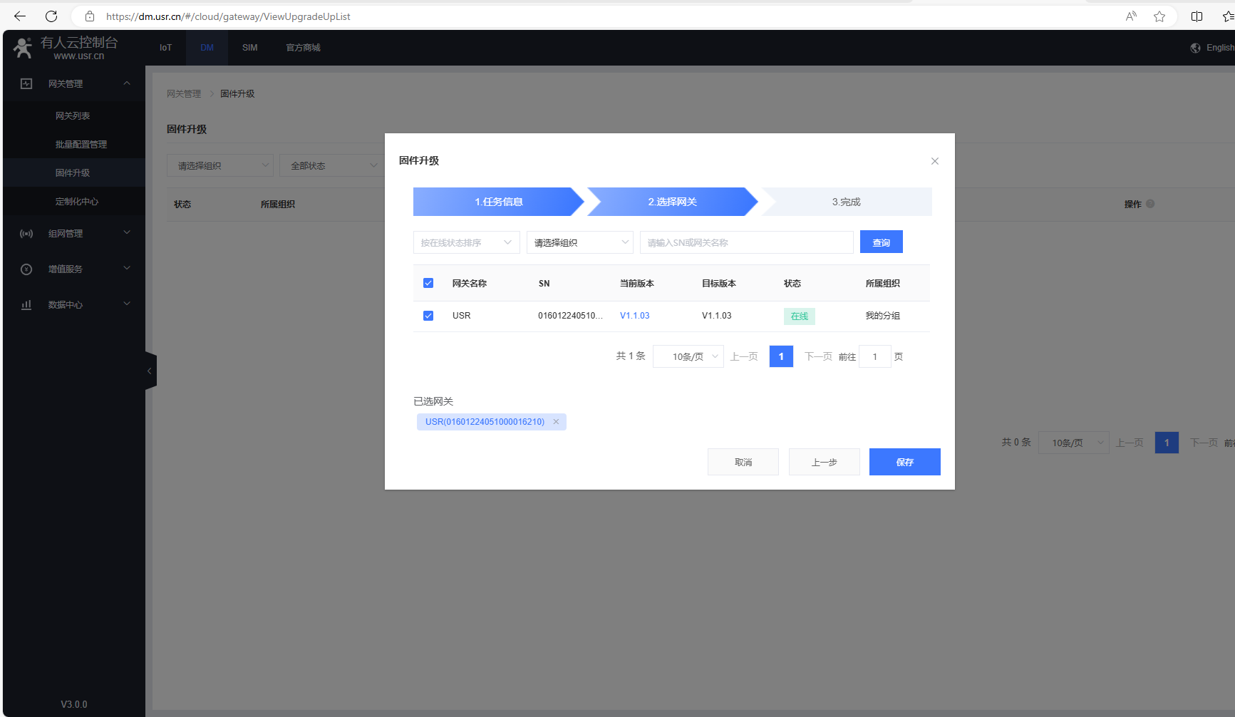 (1)點擊網(wǎng)關(guān)管理,點擊固件升級,按照步驟,選擇網(wǎng)關(guān)型號,選擇固件升級版本,點擊下一步,勾選網(wǎng)關(guān),點擊保存,最后點擊確認(rèn)。