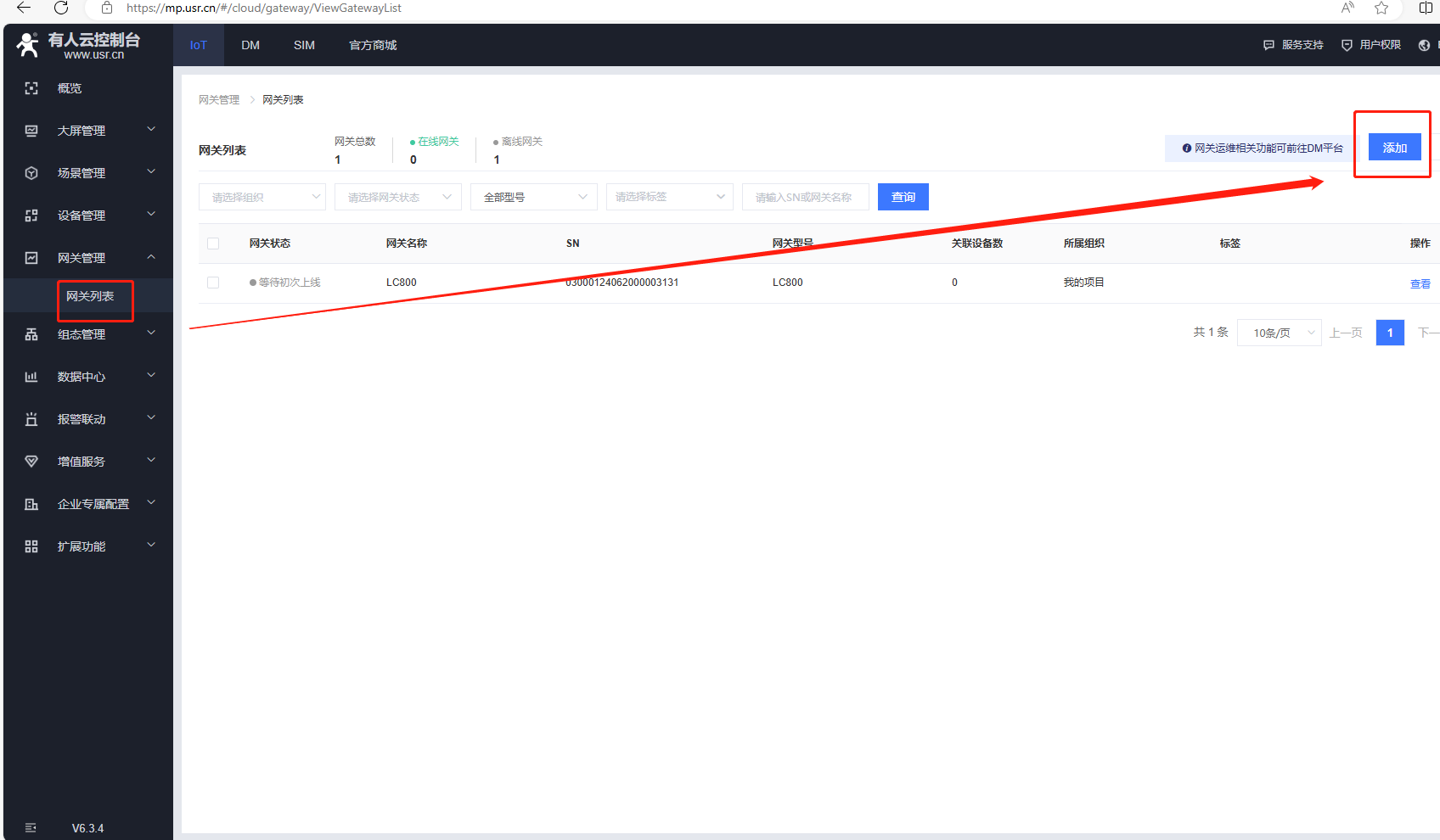 (1)IOT平臺,點擊網(wǎng)關(guān)管理,點擊網(wǎng)關(guān)列表,點擊添加。