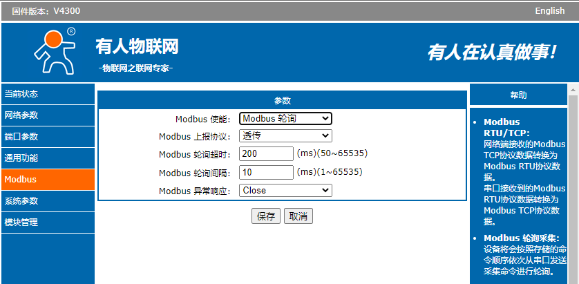 Modbus參數(shù)設(shè)置:設(shè)置為modbusTCP/RTU ,上報(bào)協(xié)議:透?jìng)?span>