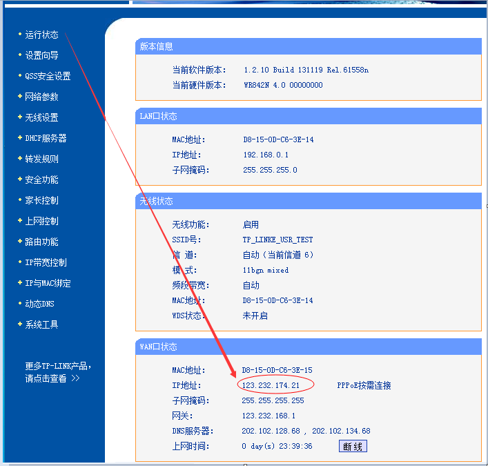 在瀏覽器上登陸路由器的設(shè)置網(wǎng)頁,在運行狀態(tài)下,檢查路由器的WAN口地址,檢查WAN口地址是否為公網(wǎng)IP,例如下圖IP是:123.232.174.21.