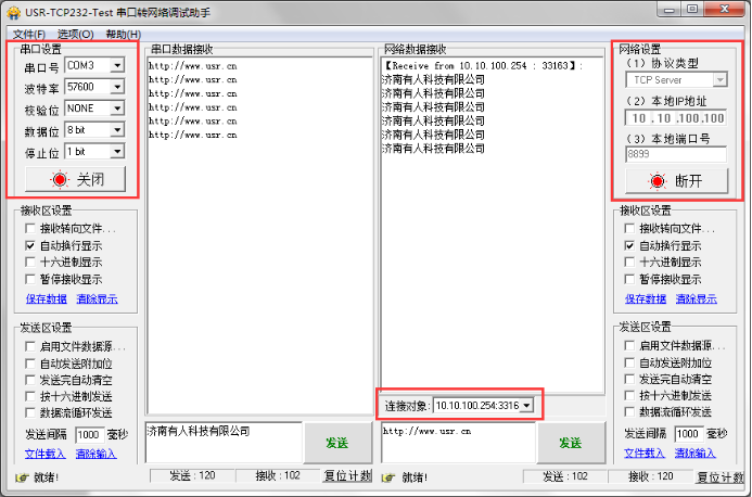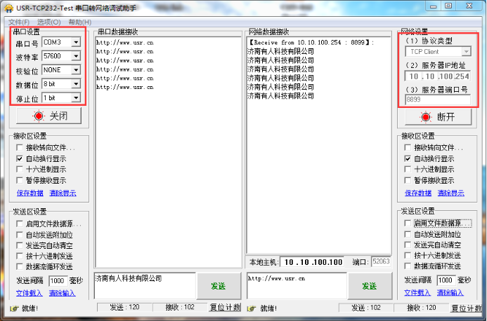 3.通信測試,串口向網(wǎng)絡(luò)發(fā)送及網(wǎng)絡(luò)向串口發(fā)送均可正常收到。
