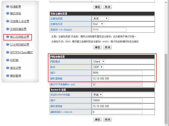 1.在串口及網(wǎng)絡(luò)設(shè)置中設(shè)置網(wǎng)絡(luò)模式為UDP Client,端口8899 。點(diǎn)擊確定,重啟模塊。