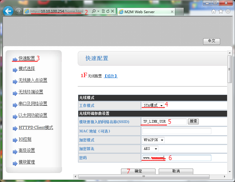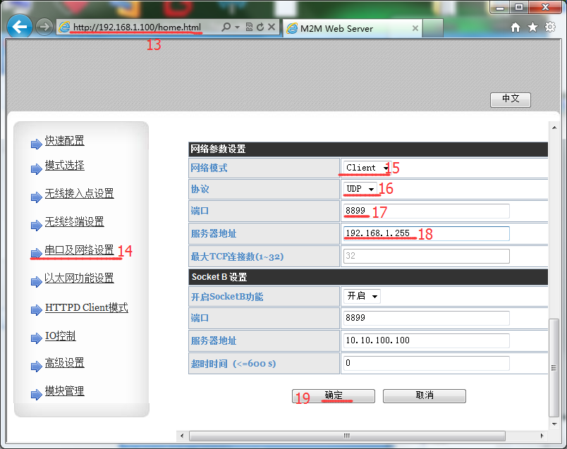 8.查詢(xún)到模塊在路由器AP中獲取到IP后,再次打開(kāi)瀏覽器(建議使用IE),在地址欄中輸入模塊獲取到IP。進(jìn)入模塊網(wǎng)頁(yè)修改參數(shù)。