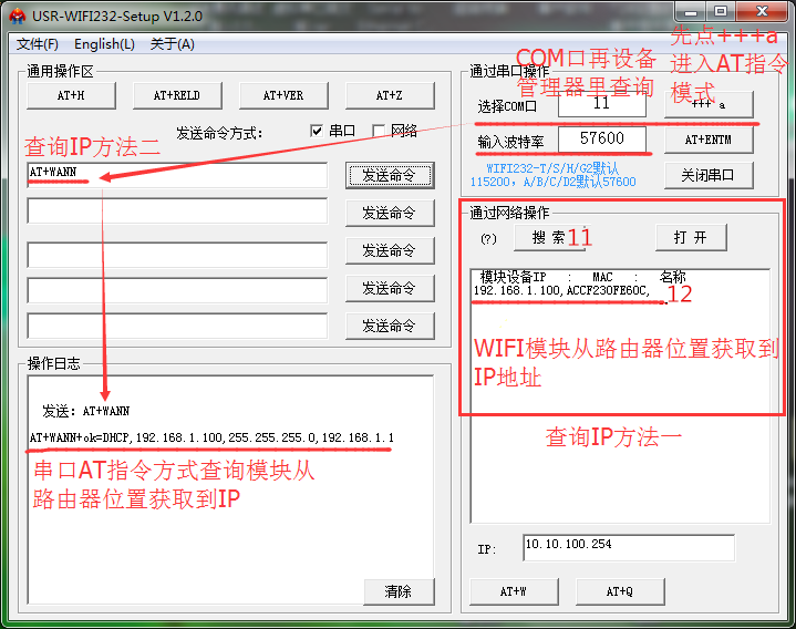 7.查詢(xún)模塊從路由器AP獲取到IP地址。查詢(xún)IP有兩種方式。