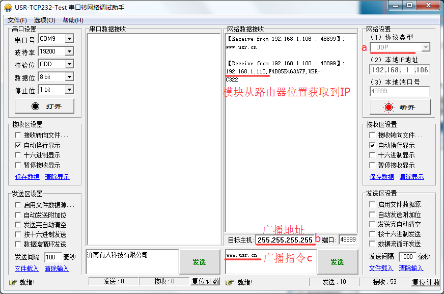 a)網(wǎng)絡(luò)搜索,使用串口轉(zhuǎn)網(wǎng)絡(luò)調(diào)試助手軟件查詢。設(shè)置為UDP 模式,目標(biāo)主機為4個255,廣播地址,廣播端口為48899.發(fā)送廣播指令wy2006.cn 返回模塊獲取到的IP(關(guān)于UDP廣播端口和廣播指令在模塊網(wǎng)頁,附加功能內(nèi)可以查看和設(shè)置),軟件點擊此處下載。