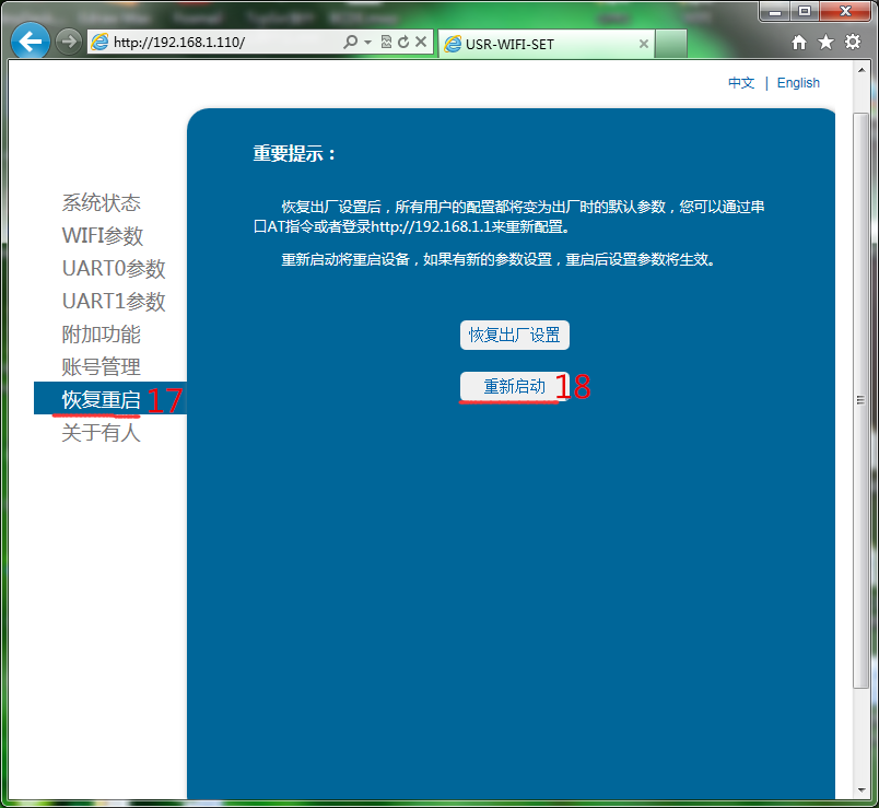 9.參數(shù)設(shè)置完成,將模塊重啟使參數(shù)生效。