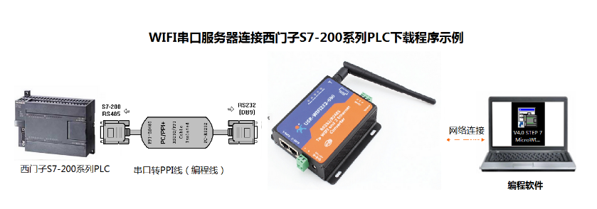 硬件連接:S7-200 PLC連接PPI編程線纜,PPI編程線纜的RS232端連接WIFI串口服務(wù)器的RS232口,WIFI串口服務(wù)器網(wǎng)口連接電腦網(wǎng)口或者路由器網(wǎng)口。
