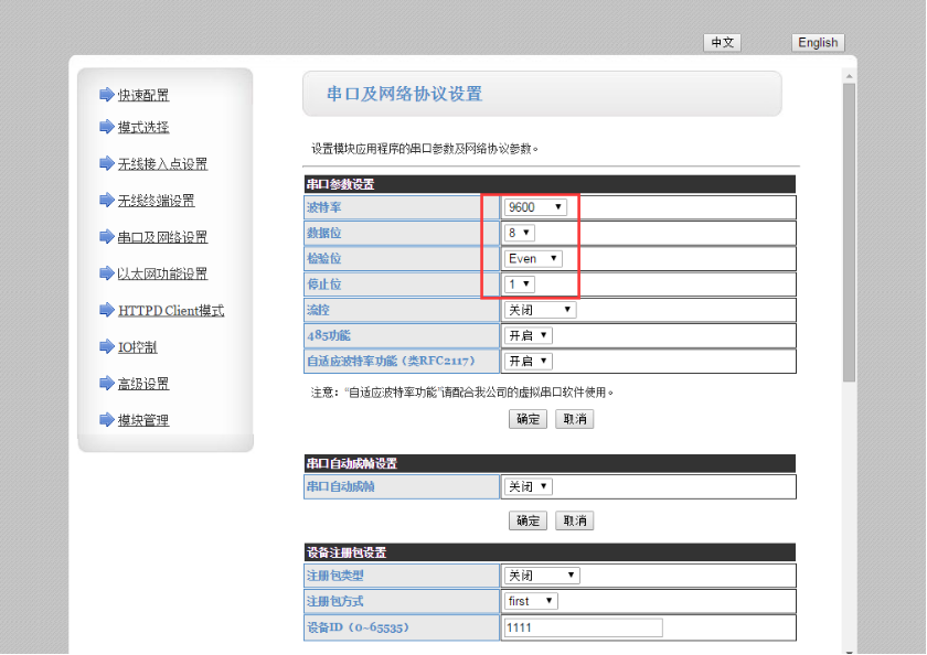 1:電腦直連WIFI串口服務(wù)器的無線或?qū)IFI串口服務(wù)器連接無線路由。登錄設(shè)置網(wǎng)頁,設(shè)置串口及網(wǎng)絡(luò)設(shè)置的波特率為9600,校驗(yàn)數(shù)據(jù)位停止位:EVEN 8 1。這個參數(shù)要和PLC的參數(shù)一致。使用485的話要把485功能選擇開啟,點(diǎn)擊確定,重啟wifi串口服務(wù)器。