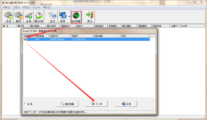 2:然后建立虛擬串口com1,點(diǎn)擊自動創(chuàng)建,勾選搜索到的設(shè)備,點(diǎn)擊下一步,提示創(chuàng)建成功,點(diǎn)擊完成