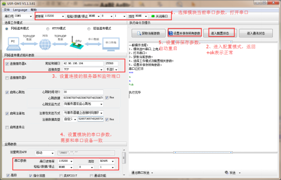 (1)設(shè)置之前必須將GPRS模塊的串口連接電腦的串口,然后用USR-GM3設(shè)置軟件V1.1.3.61設(shè)置參數(shù)。