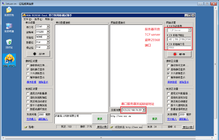 以上是服務(wù)器發(fā)送數(shù)據(jù)和接收數(shù)據(jù):以下使用電腦串口連接GPRS-DTU串口,電腦運行串口調(diào)試軟件,進(jìn)行發(fā)送和接收服務(wù)器的數(shù)據(jù)。