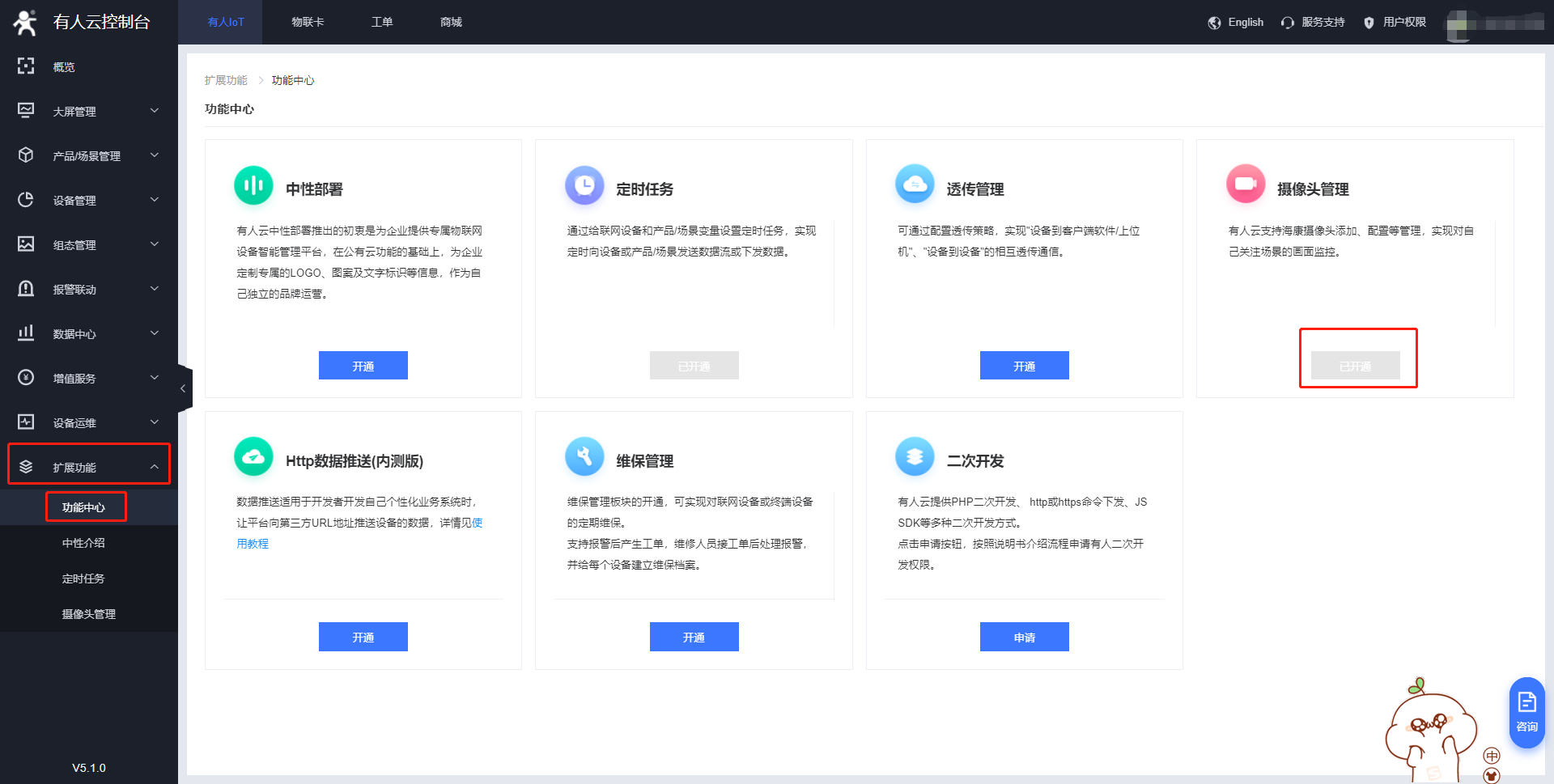 3、在擴(kuò)展功能---功能中心將攝像頭管理開通,左側(cè)列表生成該項欄,點擊進(jìn)入攝像頭管理