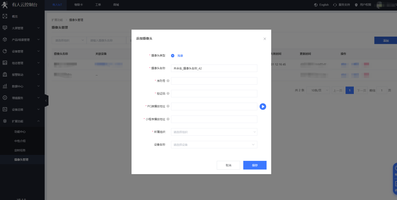 4、點擊添加鍵,選擇海康攝像頭,如下圖所示,序列號為攝像頭機(jī)身上的序列號,驗證碼為攝像頭機(jī)身上的驗證碼,PC端播放地址和小程序播放地址,需要在螢石云平臺去查看,根據(jù)想要綁定的設(shè)備選擇所在的組織和設(shè)備。點擊保存