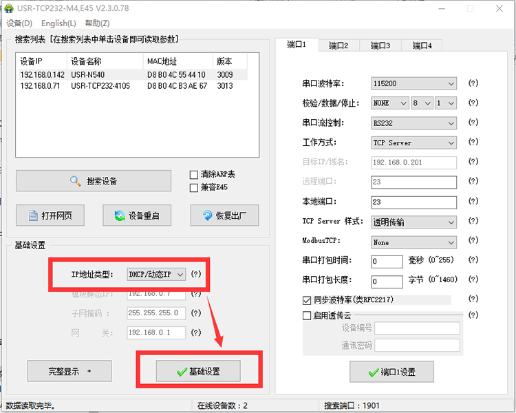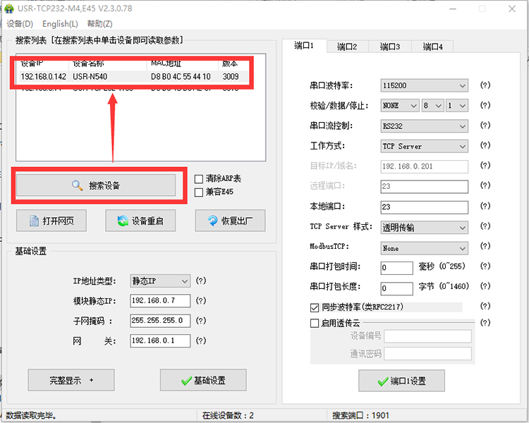 5、打開(kāi)參數(shù)設(shè)置軟件USR-TCP232-M4,E45-V2.3.0.78.exe ,點(diǎn)擊“搜索設(shè)備”,點(diǎn)擊搜索到的模塊IP,選擇實(shí)際使用的端口 號(hào),此處以端口一,RS232串口舉例,配置參數(shù)如圖,點(diǎn)擊“端口1設(shè)置”