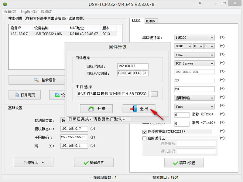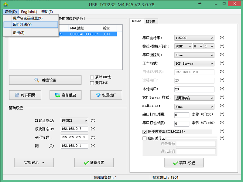 2、點(diǎn)擊一下搜索到的M4產(chǎn)品,點(diǎn)擊右上角的“設(shè)備”,選擇“固件升級(jí)”。