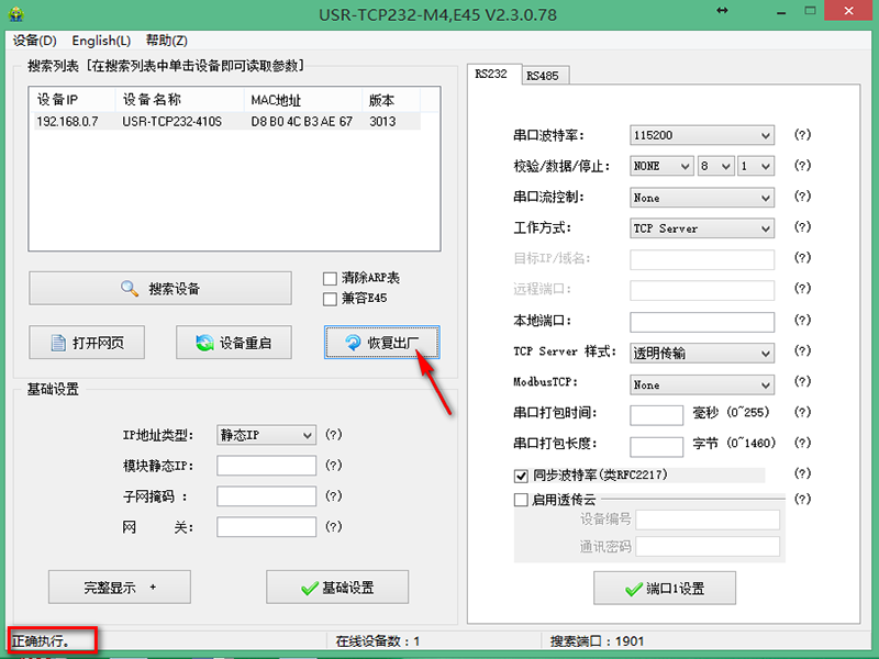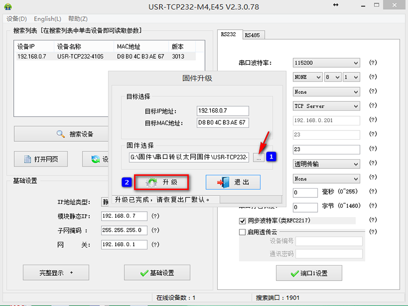 將電腦和M4產(chǎn)品直接網(wǎng)線對(duì)接,設(shè)置電腦IP和M4在同一個(gè)網(wǎng)段,使用配置軟件搜索設(shè)備后升級(jí)固件,升級(jí)完成后點(diǎn)擊“恢復(fù)出廠設(shè)置”才能正常使用。