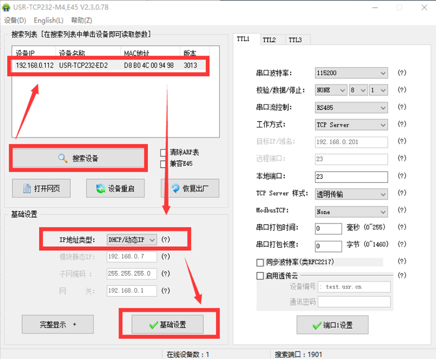 1、將M4模塊網線直連電腦,打開參數(shù)設置軟件(下載地址http://wy2006.cn/Download/90.html),點擊“搜索設備”,點擊搜索到的設備名稱,將IP類型改為“DHCP”,點擊“保存參數(shù)”,如圖
