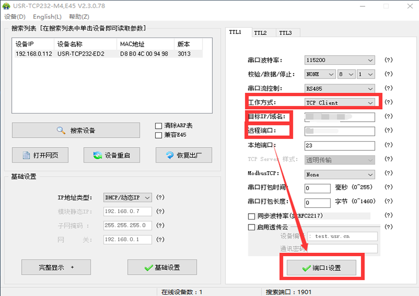 3、將M4模塊網線直連路由器,電腦連入該路由器,打開參數(shù)設置軟件,重新搜索設備,設置模塊工作方式為“TCP Client”,目標IP設置為公網服務器的公網IP,遠程端口號為服務器上上位機軟件的端口號。點擊“保存參數(shù)”,如圖