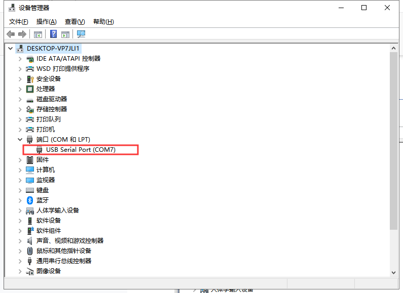其中串口號(hào)可以在電腦的“設(shè)備管理器”中查看,見(jiàn)下圖;