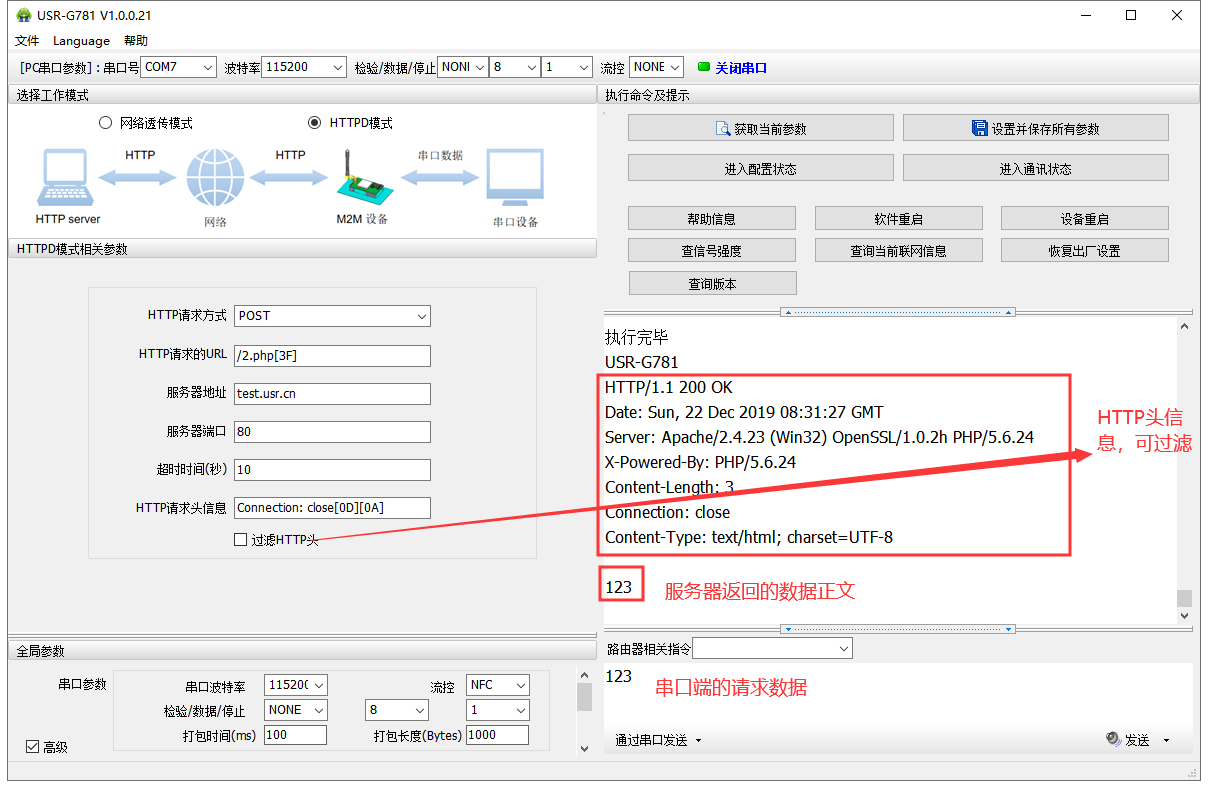在發(fā)送區(qū)填寫(xiě)數(shù)據(jù),點(diǎn)擊發(fā)送,則可在接收區(qū)域接收到服務(wù)器的返回,其中HTTP頭信息可以設(shè)置過(guò)濾掉。