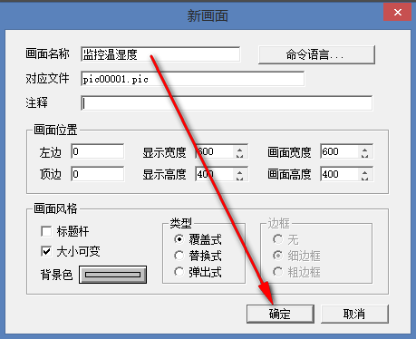 4.8點擊“畫面”,新建一個畫面,畫面名為監(jiān)控溫濕度,點擊“確定”,進(jìn)入畫面編輯欄。