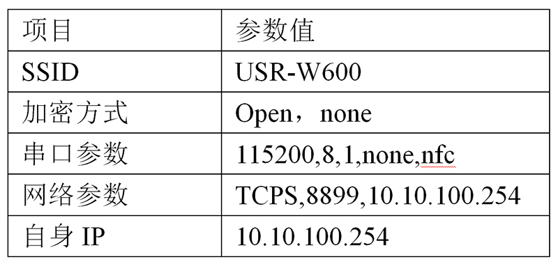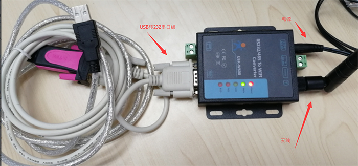 USR-W600(以下簡(jiǎn)稱W600)接上供電電源,此時(shí)Power指示燈亮起;將W600的串口通過(guò)串口線(或者USB轉(zhuǎn)232)接到電腦上,裝上Wi-Fi天線,模塊正常啟動(dòng)后,work指示燈常亮。