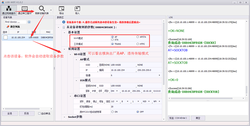 3> 打開設(shè)置軟件,選擇“通過(guò)網(wǎng)絡(luò)搜索”-->“刷新設(shè)備列表”,就能夠搜索到W600這個(gè)設(shè)備;可以在這個(gè)軟件中根據(jù)實(shí)際應(yīng)用修改W600的各種參數(shù),這里我們只是做入門測(cè)試,就按照出廠默認(rèn)的方式來(lái)測(cè)試。
