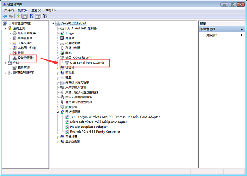 4> 查看W600在電腦上對(duì)應(yīng)的COM號(hào),在設(shè)備管理器中可以查看,這里是COM9