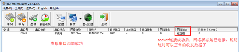 注意:虛擬串口的參數(shù)和上面小黃人的網(wǎng)絡(luò)端設(shè)置是一致的,所以虛擬串口和小黃人的網(wǎng)絡(luò)端不能同時(shí)使用,否則會(huì)出現(xiàn)沖突,導(dǎo)致數(shù)據(jù)不能正常傳輸。