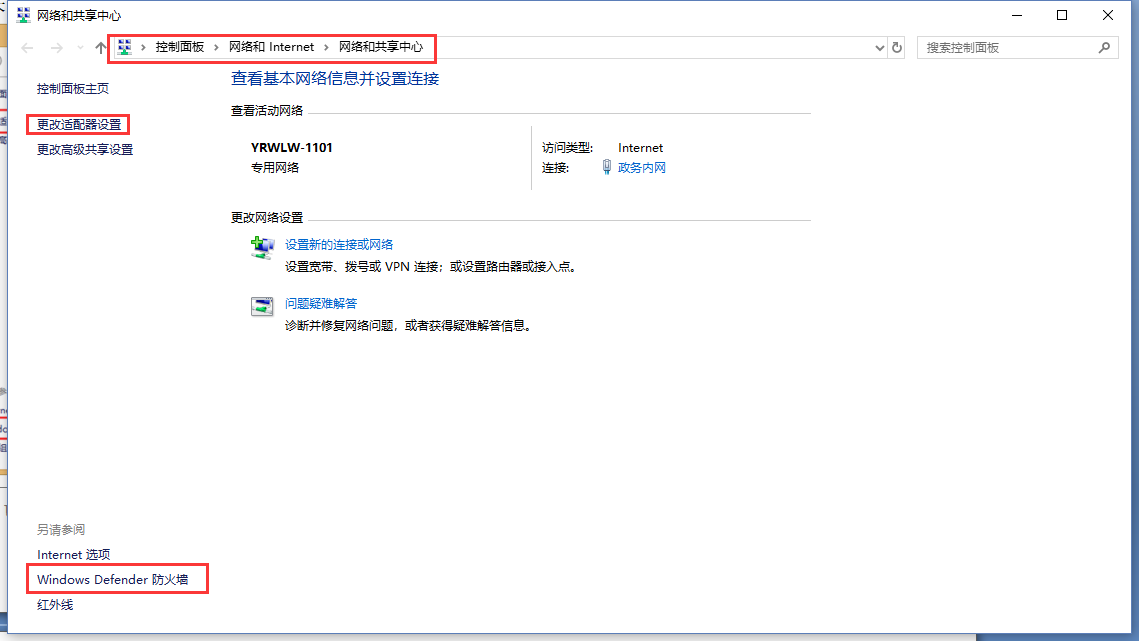 2.按路徑:控制面板》網(wǎng)絡(luò)和Internet》網(wǎng)絡(luò)和共享中心找到“windows防火墻”和“更改適配器設(shè)置”選項(xiàng),關(guān)閉防火墻并禁用與本次測試無關(guān)的網(wǎng)卡。并關(guān)閉電腦殺毒軟件。