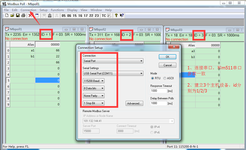 5、打開 Modbus Poll,設(shè)置正確的參數(shù),M511 串口接Modbus_RTU_ Poll,所以將Modbus Poll設(shè)置為串口,RTU 協(xié)議, id為1/2/3和上面設(shè)置對應(yīng)