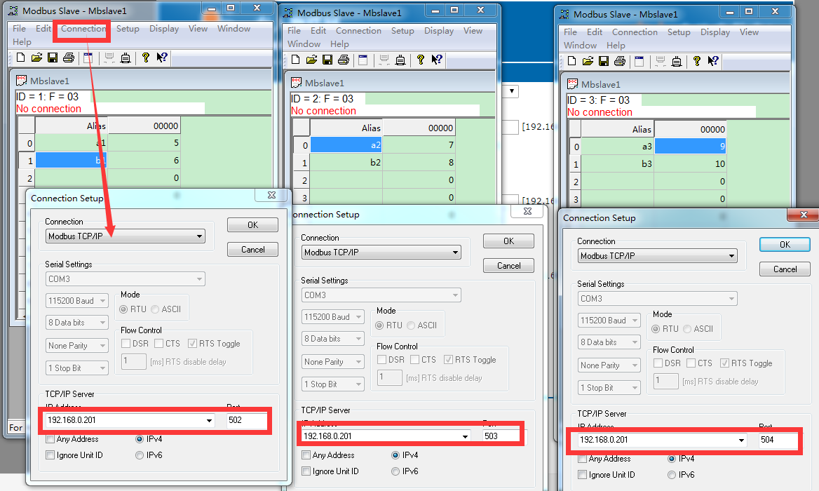 6、 打開“Modbus Slave”,選擇Modbus TCP/IP 模式,設(shè)置好目標(biāo) IP: 192.168.0.201,目標(biāo)端口號502、503、504;id為1/2/3和m511設(shè)置的對應(yīng),(打開軟件三次,分別建立三個modbus tcp從機(jī)) 點(diǎn)擊OK,如下圖所示