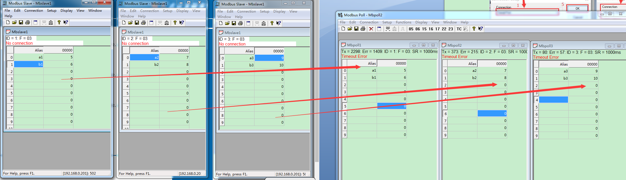 4、 打開測試軟件“Modbus Poll” 和“Modbus Slave”連接好硬件。