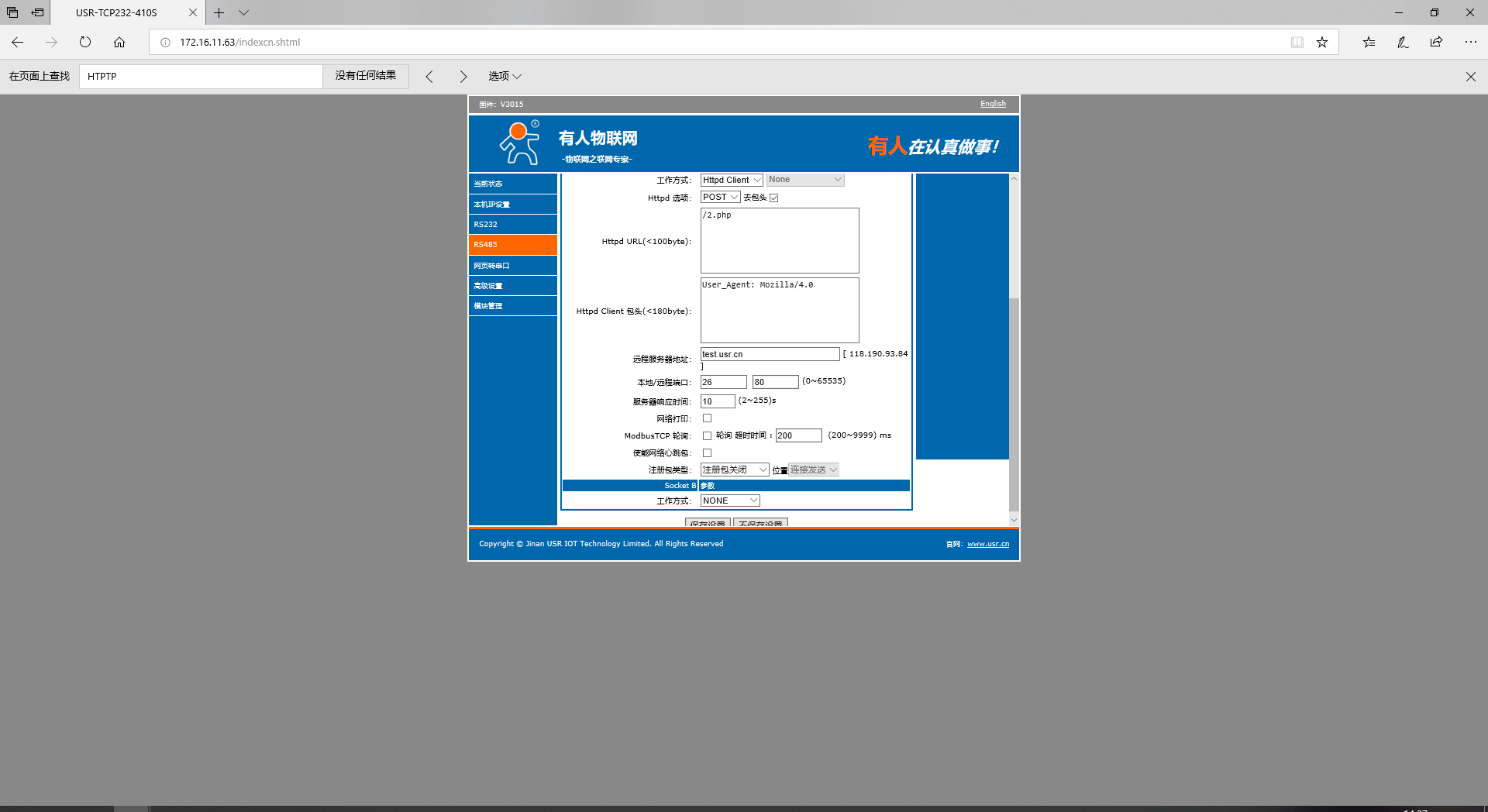 2、模塊設置參數:打開設置軟件,模塊設置為Httpd Client模式,請求方式POST,URL為/2.php,設置服務器地址test.usr.cn,端口80,設置并保存所有參數,重啟模塊。(本說明文檔使用為有人測試服務器)