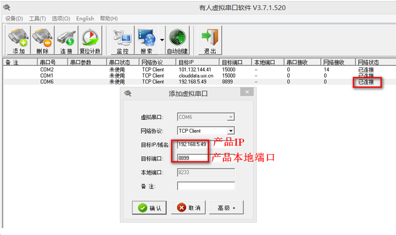 虛擬串口(網(wǎng)絡(luò)狀態(tài)顯示 已連接,說明連接正常)