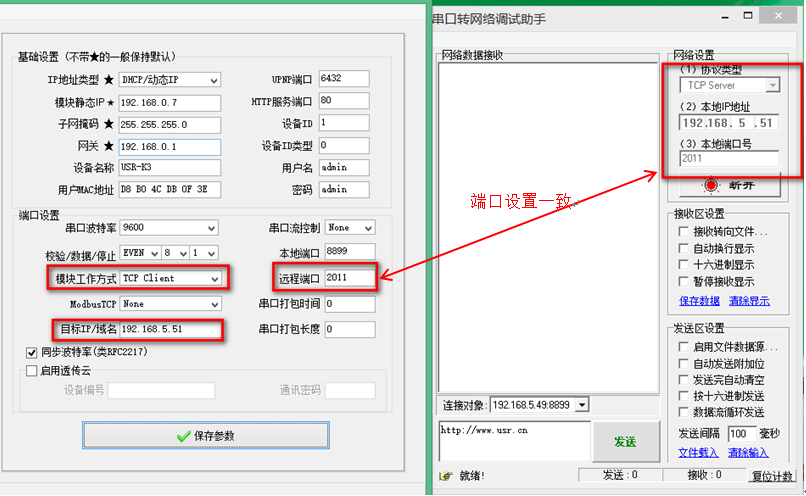 必須是一端為TCP CLIENT(客戶端),另一端為TCP SERVER(服務(wù)器端)