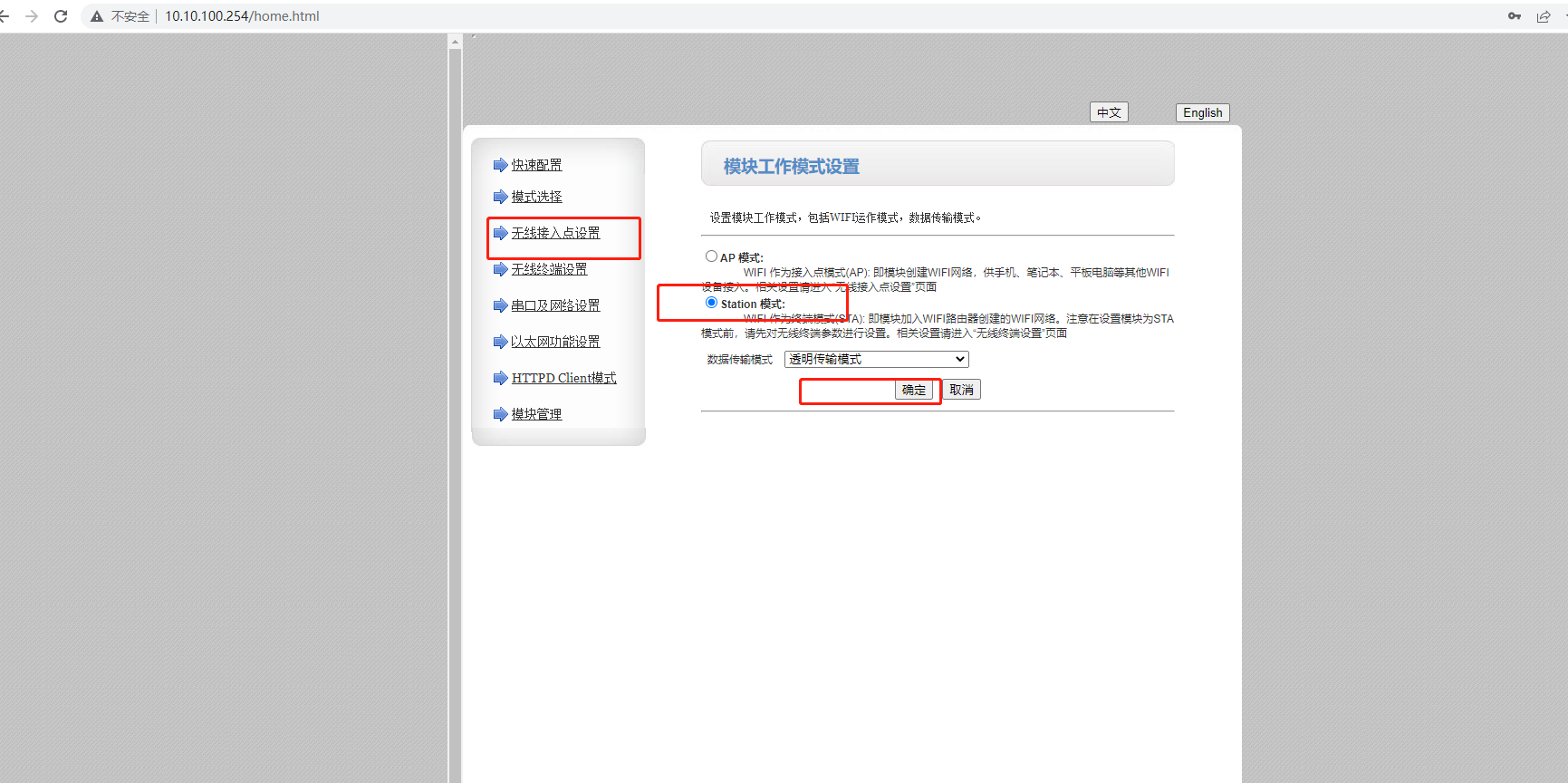 4、模式選擇: STA,透明傳輸。 注:確定后,不用立刻重啟,等著全部修改完成一塊重啟。