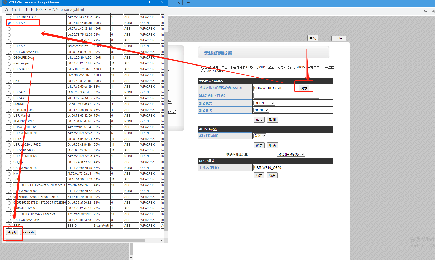 6. 無(wú)線終端設(shè)置: 搜索---選擇需要加入的路由器名稱---應(yīng)用(Apply)
