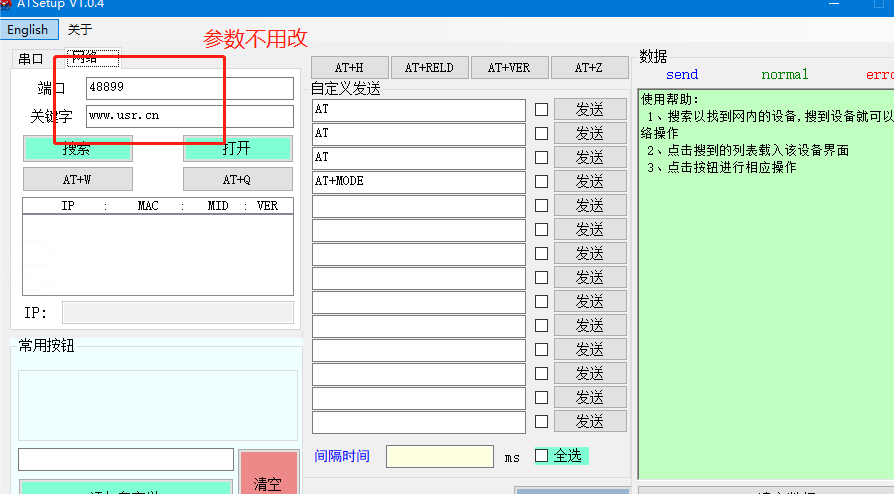 在這個(gè)選項(xiàng)中,可以設(shè)置W610的串口參數(shù)以及網(wǎng)絡(luò)參數(shù),客戶可以根據(jù)實(shí)際情況確認(rèn)是否需要修改波特率以及W610的網(wǎng)絡(luò)工作模式,在本案例中不做修改,采用默認(rèn)狀態(tài)。