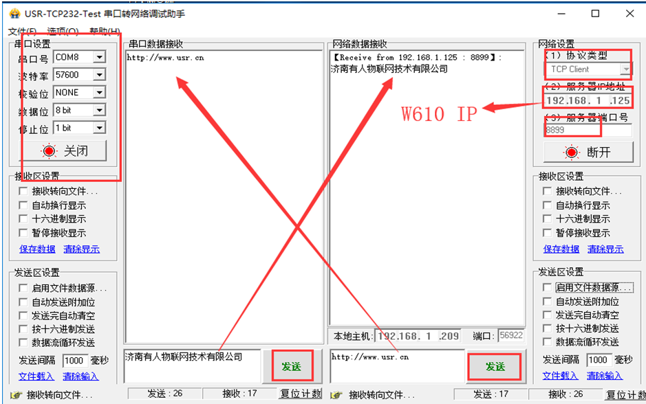 串口和網(wǎng)絡(luò)相互收發(fā)數(shù)據(jù)成功,說明通訊是正常的