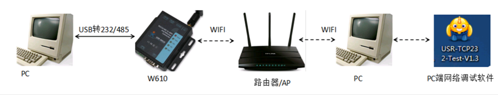 1、硬件連接:W610接上wifi天線,串口通過USB轉(zhuǎn)232/485接到PC,上電。W610正常啟動(dòng)后,電源指示燈常亮,work指示燈閃爍。