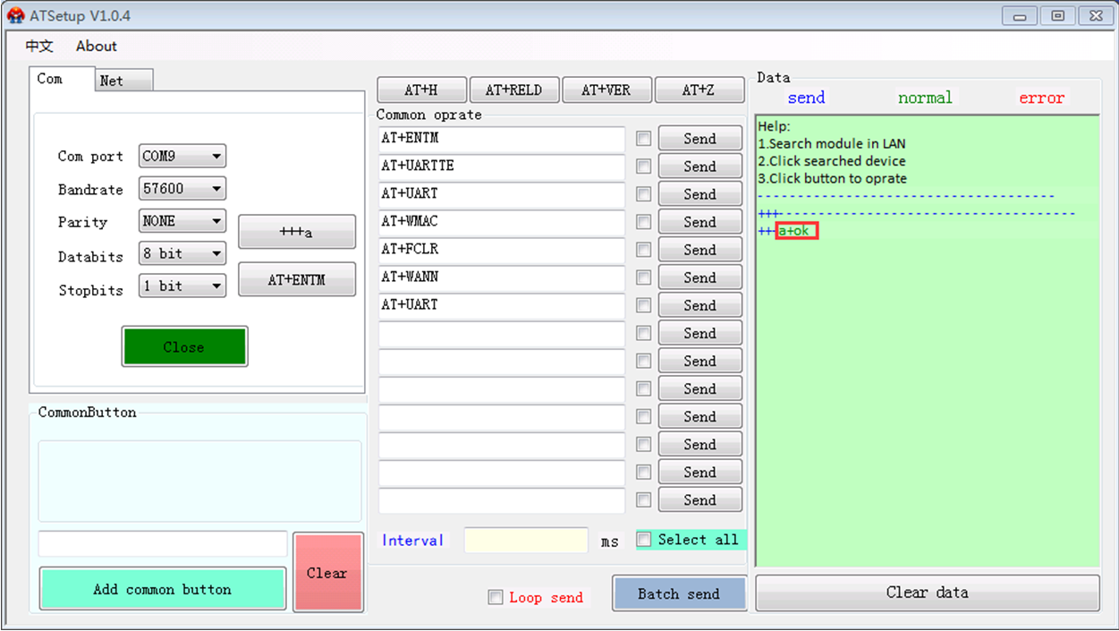 1>打開軟件,設(shè)置好串口參數(shù),默認(rèn)是57600,n,8,1,打開串口;點(diǎn)擊+++a,模塊會返回+ok的字符,說明進(jìn)入AT指令成功
