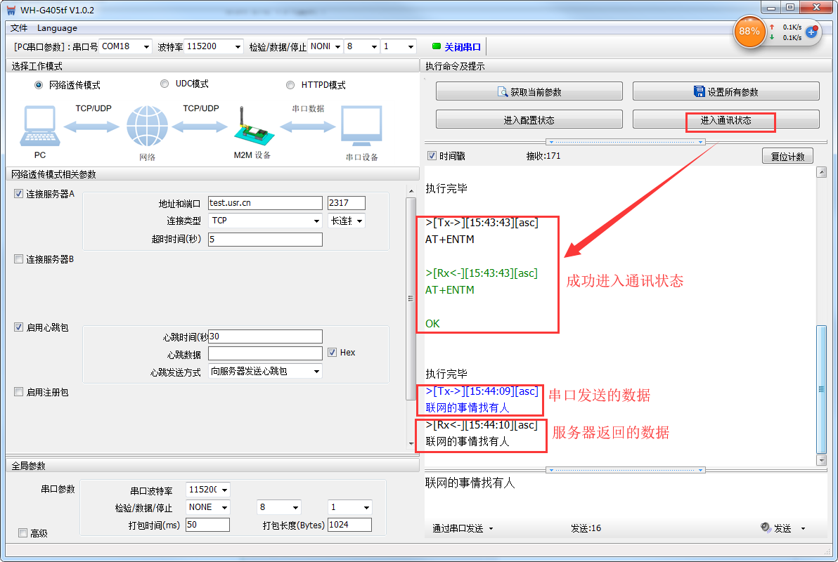 通過(guò)串口發(fā)送<聯(lián)網(wǎng)的事情找有人>,可以看到服務(wù)器返回了相同的內(nèi)容,說(shuō)明DTU工作是沒(méi)有問(wèn)題的