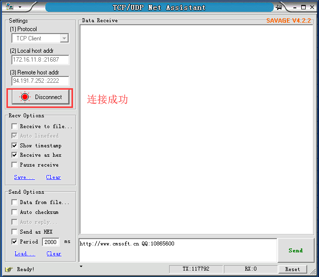 服務(wù)器IP和端口是:94.191.7.252:2222,我們再用軟件測試,可以連接成功。那么用DTU也是可以連接這個地址和端口的。